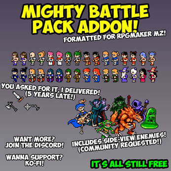 32 sideview characters formatted for RPGMaker MZ (sprites are scaled x2) but could theoretically be used anywhere. Includes a few community suggested monster graphics and weapons.